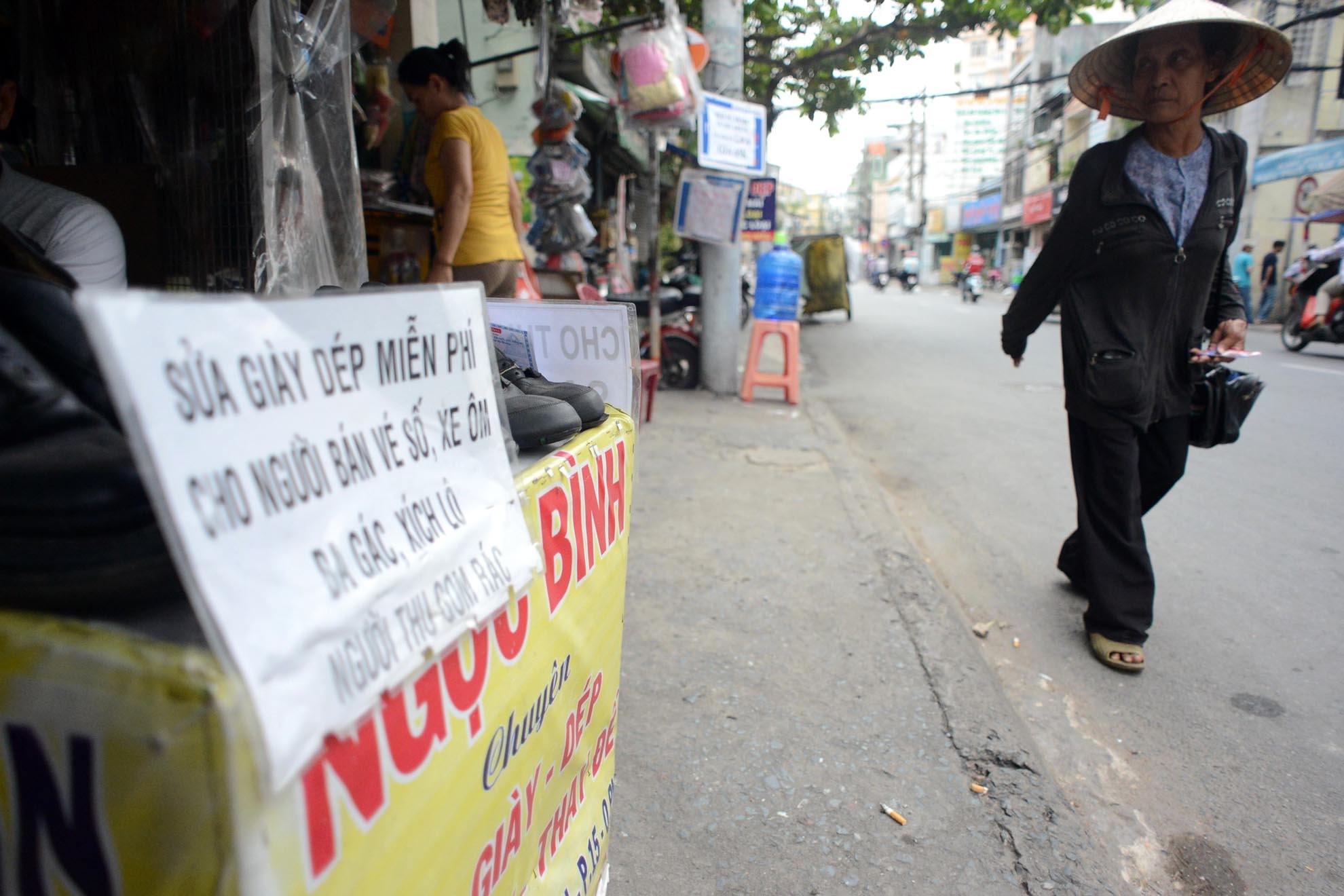 | Lâu nay, những ai đi ngang qua đường Huỳnh Văn Bánh, quận Phú Nhuận (TP.HCM) đều bị thu hút bởi tấm biển "Sửa giày dép miễn phí cho người bán vé số, xe ôm, ba gác, xích lô, người thu gom rác". |