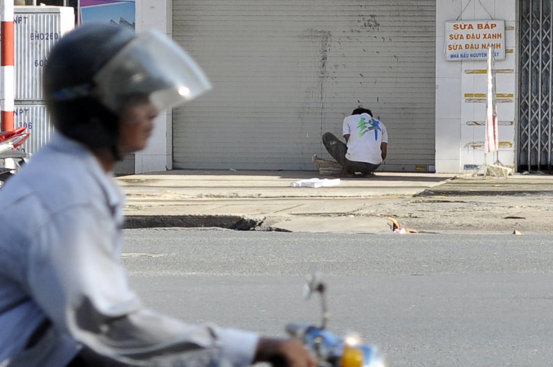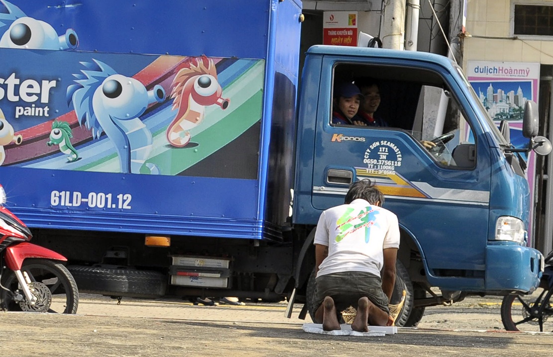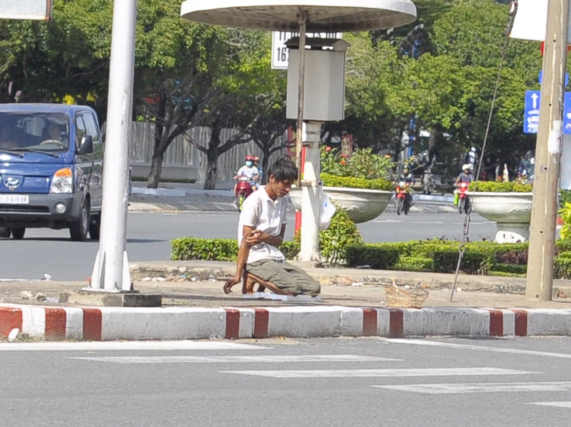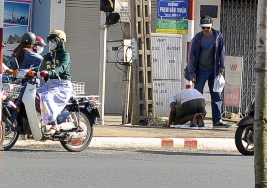 Nam thanh niên đến các giao lộ, để chiếc giỏ trước mặt rồi quỳ lạy liên tục xin tiền người đi đường. Thỉnh thoảng, anh ta ngáp dài và gãi khắp người.