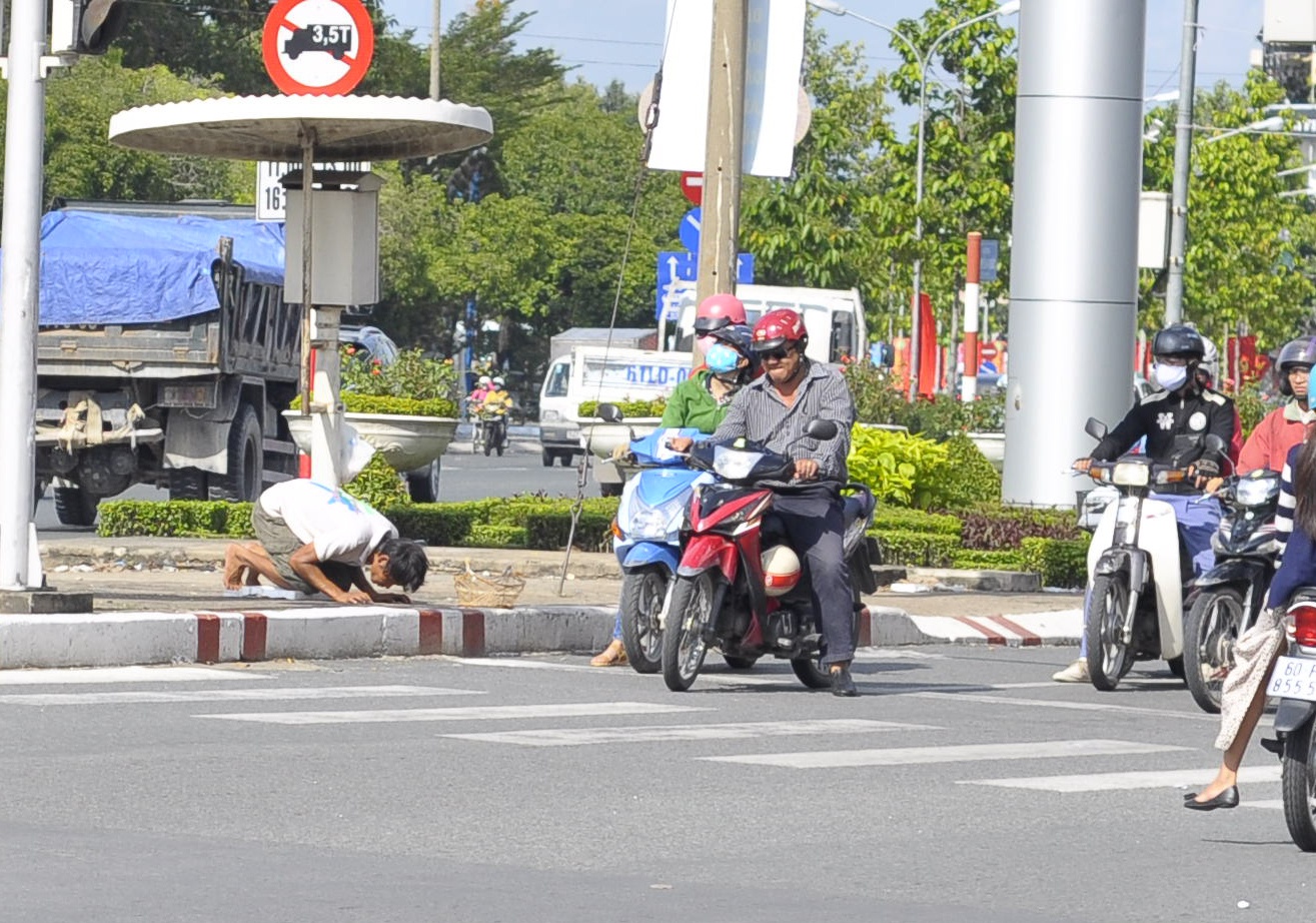 Người này chọn vị trí sát cột đèn giao thông rồi để chiếc giỏ tre hoặc bát nhựa trước mặt, sau đó quỳ lạy liên tục.