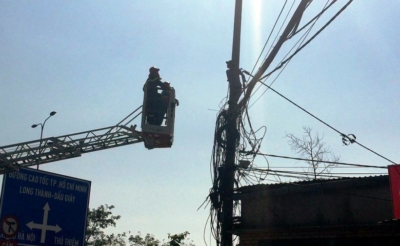 | Các chiến sĩ cứu hộ tiếp cận nam thanh niên trèo cột điện. Ảnh: Nguyên Hải. |
