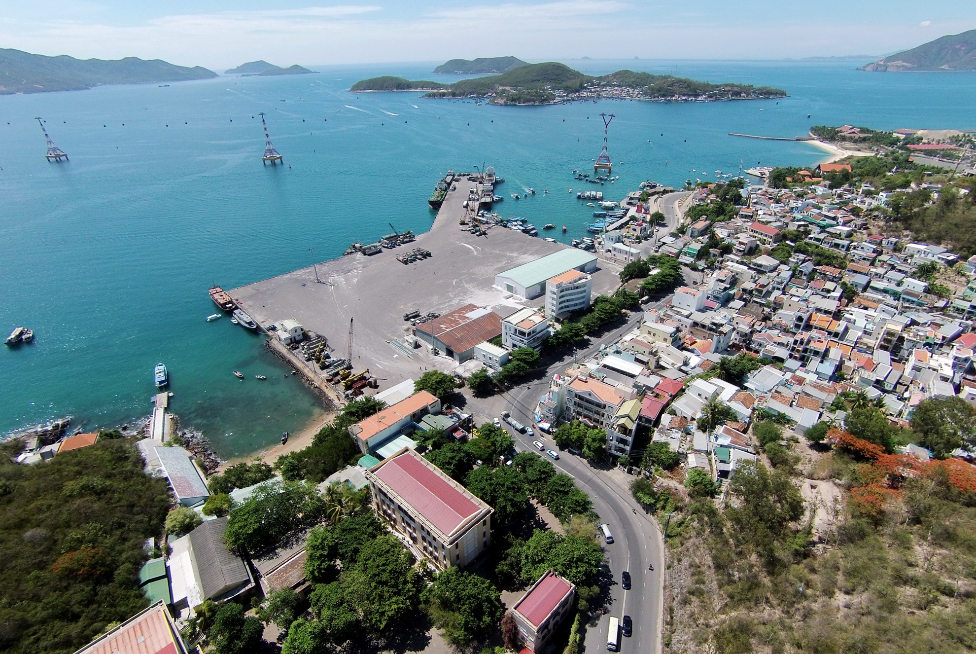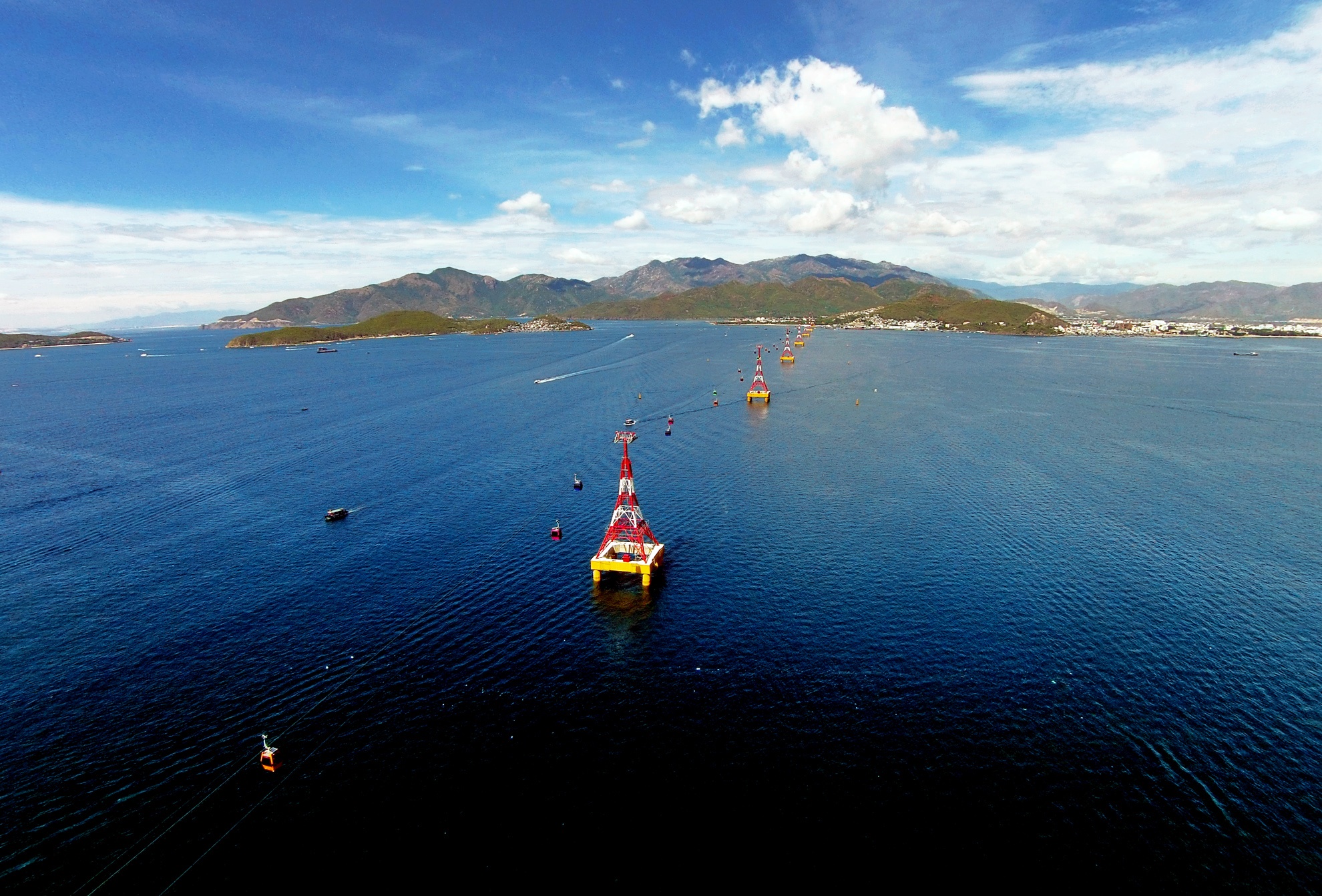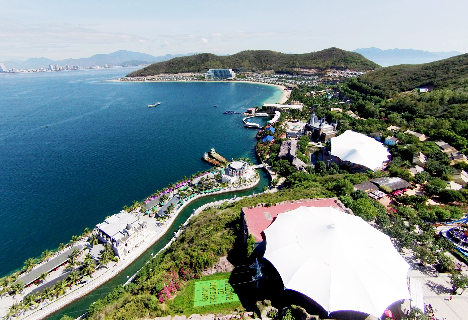 Vinpearl Land nhìn từ trên cao.Từ thành phố vào hòn đảo này, du khách phải sử dụng hệ thống cáp treo hoặc phà, tàu cao tốc hoặc ca nô. Đây là một quần thể vui chơi giải trí với các trò cảm giác mạnh du nhập từ nước ngoài, hệ thống resort và khách sạn 5 sao, thủy cung rộng 3.400 m² như một đại dương thu nhỏ với 300 loài sinh vật biển lạ mắt.
