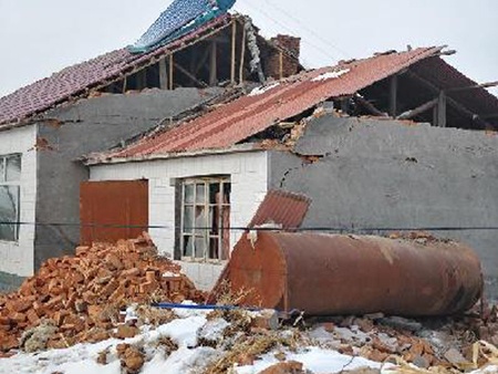 | Một ngôi nhà bị hư hại nặng vì động đất. Ảnh: Tân Hoa xã. |