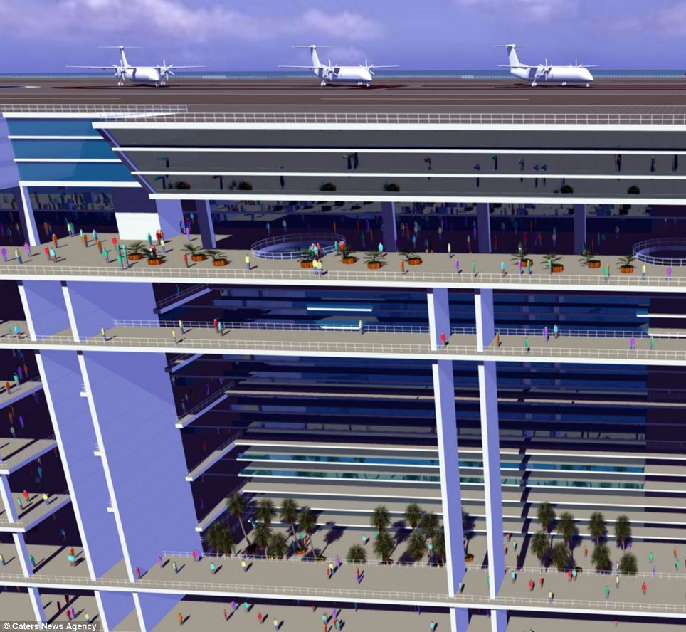 Sân bay trên nóc thành phố nổi có thể phục vụ các máy tư nhân và máy bay thương mại cỡ nhỏ chở tới 40 khách mỗi lượt. Ảnh: Dailymail.