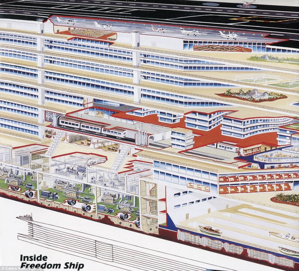 Thành phố nổi là một khu liên hợp, được trang bị giống như một thành phố trên đất liền với đầy đủ cơ sở hạ tầng như trường học, bệnh viện, phòng trưng bày nghệ thuật, cửa hàng, công viên, khu nuôi cá cảnh, sòng bạc, thậm chí cả sân bay trên nóc của con tàu. Ảnh: Dailymail.