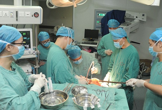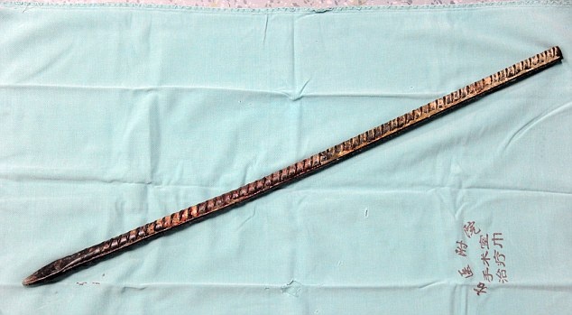 | Các bác sĩ tiến hành phẫu thuật loại bỏ phần còn lại của thanh kim loại dày gần 3 phân và dài hơn 1 m. |