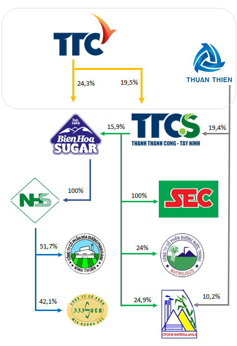 Trước đây, TTC không muốn công khai việc nắm trong tay cùng lúc nhiều doanh nghiệp mía đường lớn; do đó mà sở hữu tại từng công ty bị phân mảnh dẫn đến tình trạng sở hữu chéo rất phức tạp. Tuy nhiên, song song với sự trở lại của ông Thành, tình hình đã có sự thay đổi đáng kể.