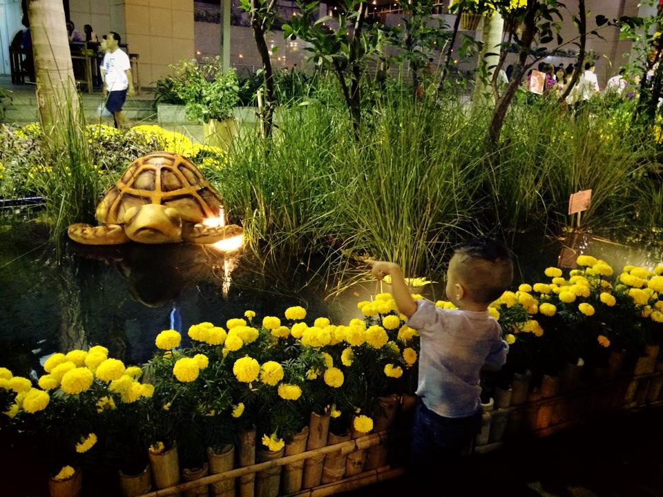 Jacky hào hứng ngắm chú rùa đá được trang trí ở đường hoa.