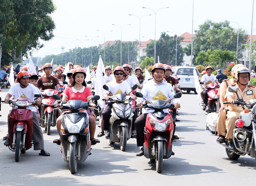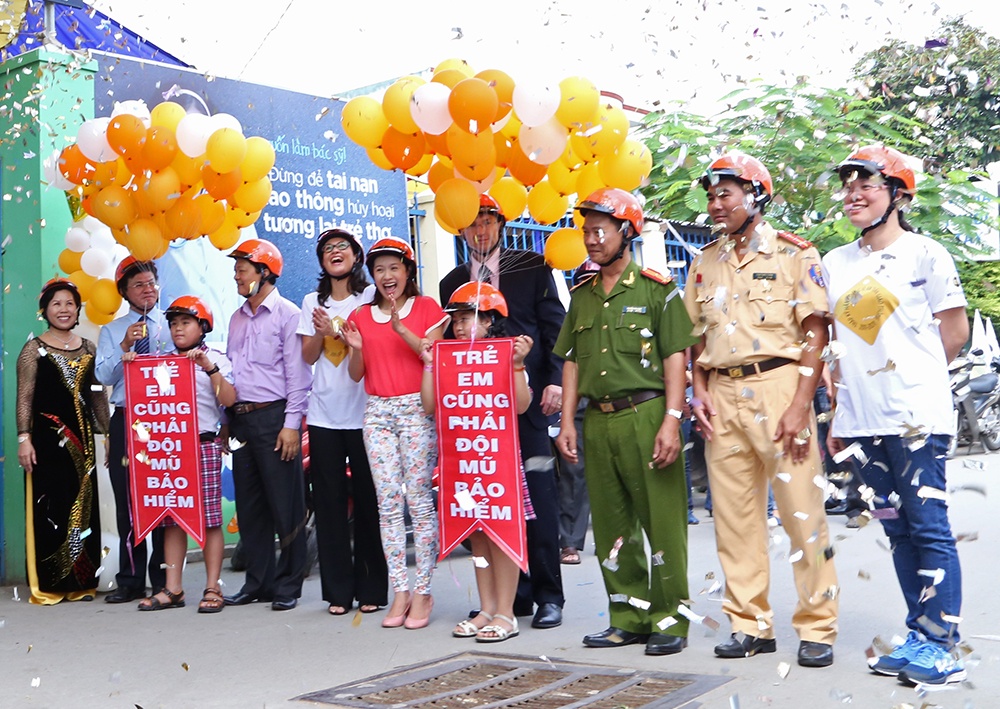 Bên cạnh lễ phát động tại trường học, Thanh Thúy, các đại biểu cùng phụ huynh, học sinh đã tham gia diễu hành trên các tuyến đường quanh trường nhằm thúc đẩy sự thay đổi hành vi đội mũ bảo hiểm đạt chuẩn cho trẻ em.