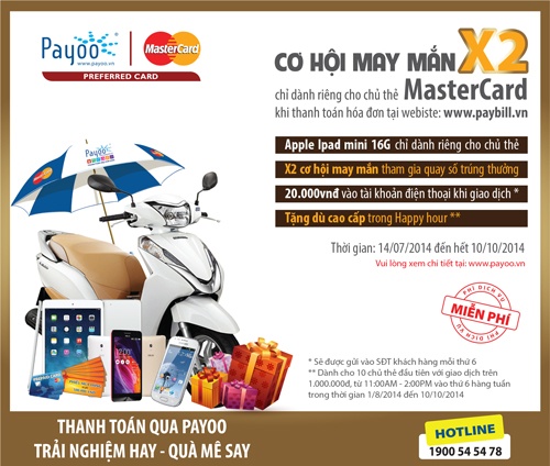 Payoo phối hợp với MasterCard giới thiệu đến khách hàng website thanh toán hóa đơn www.paybill.vn, nhằm giúp các chủ thẻ có thể thanh toán ở bất cứ đâu, bất cứ lúc nào, và tận hưởng 45 ngày dùng trước trả sau không lãi suất với chủ thẻ tín dụng. Trong dịp khuyến mại này, chủ thẻ MasterCard (bất kể thẻ tín dụng, thẻ ghi nợ, thẻ trả trước hay thẻ doanh nghiệp) đều có thêm ưu đãi nhận topup điện thoại trị giá 20.000 đồng cho mọi giao dịch thanh toán thành công.