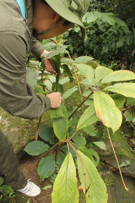Anh Thanh dùng dao nhọn bới lớp mùn lọt trong khe đá, rồi nhấc bổng cả củ, rễ và lá cây lên. Thân cây rất nhỏ, chỉ bằng cái đũa, có 7 chiếc lá hình răng cưa xòe thành một mặt phẳng trông khá kỳ quái. Dù thân nhỏ, nhưng của nó lại khá to, dài, cong queo, thành đốt, trông như củ dong.