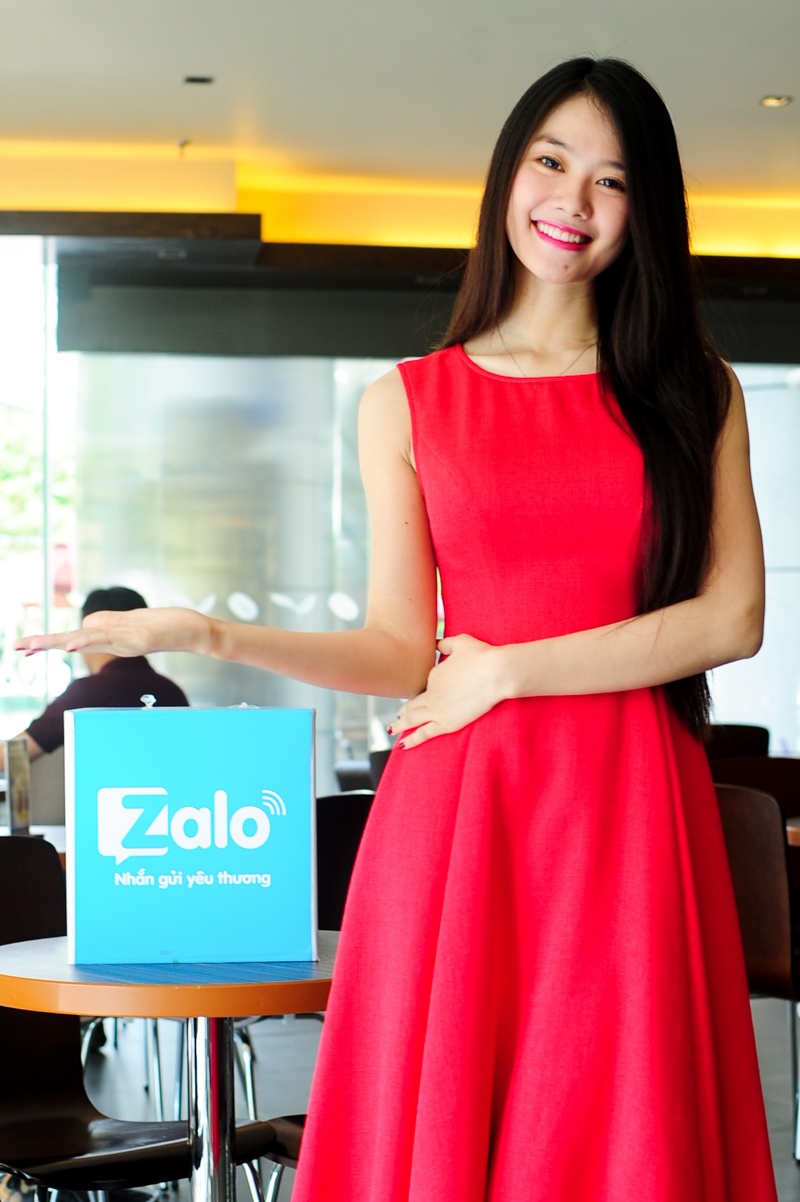 | Linh Chi khoe vẻ đẹp và nụ cười dịu dàng trong chiếc đầm đỏ thắm. Cô khoe món quà mà các khách hàng may mắn sẽ nhận được khi tham gia chương trình bốc thăm của Zalo. |