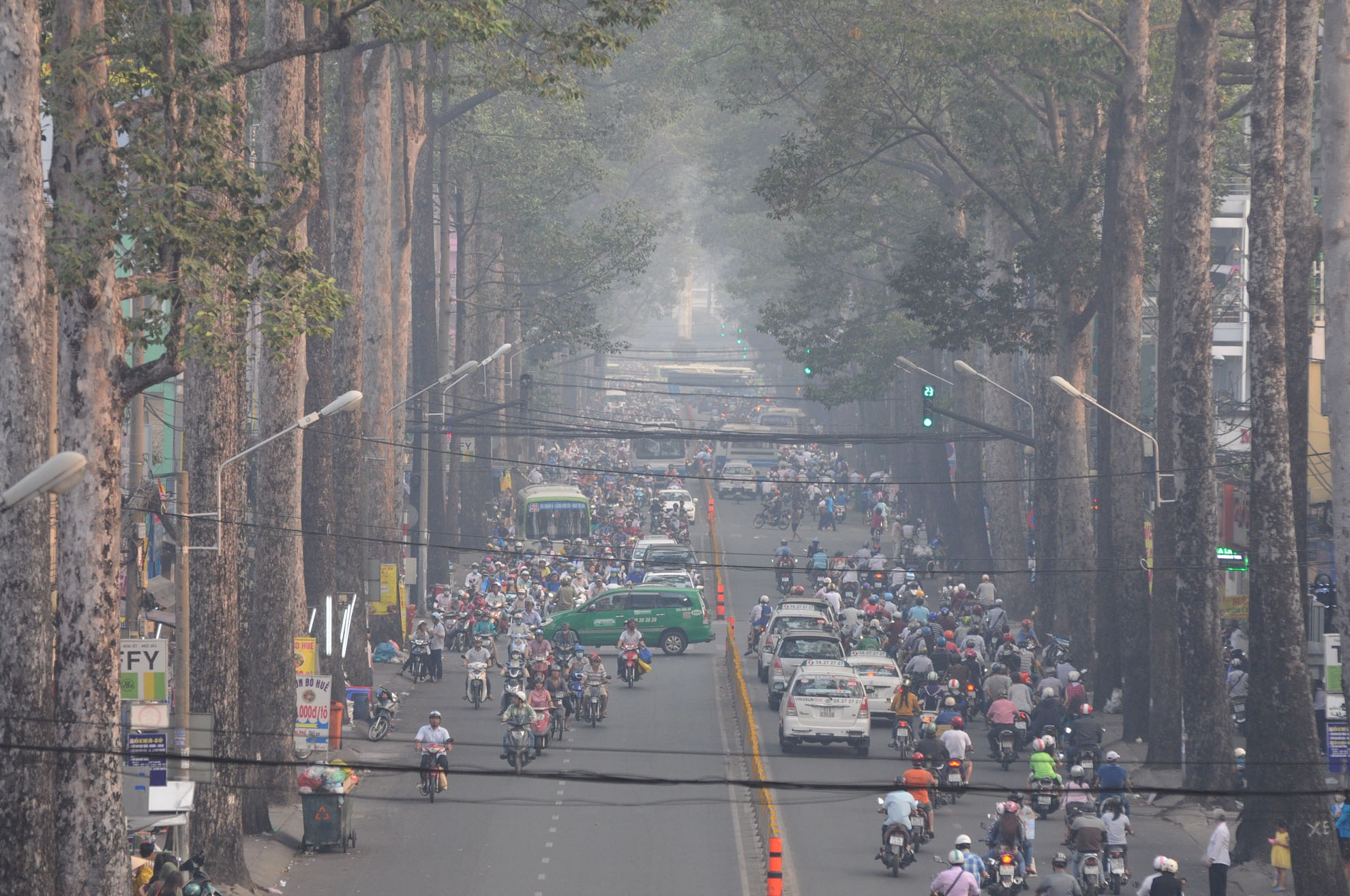 | Xe cộ lưu thông trong sương mù trên đường Nguyễn Tri Phương (quận 10). |