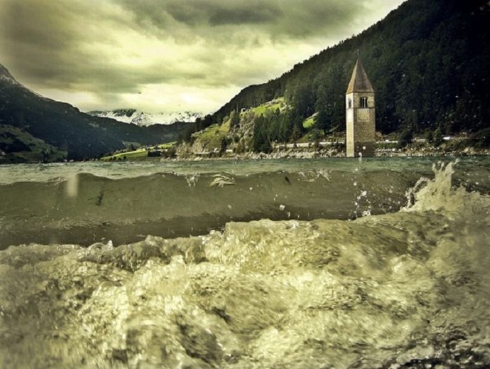 Một nửa tháp chuông nổi trên mặt nước là tất cả những gì người ta có thể nhìn thấy tại thị trấn Curon Venosta xinh đẹp.