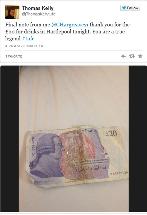 Thomas Kelly, một trong số những CĐV may mắn nhận được món quà an ủi của Hargreaves, đã chia sẻ lại câu chuyện lên Twitter. “Lời nhắn gửi cuối cùng của tôi: Hargreaves, cảm ơn ông vì 20 bảng cho bữa nhậu tối nay. Ông đúng là một huyền thoại”. Cách đối xử với CĐV của Hargreaves đúng là có một không hai.