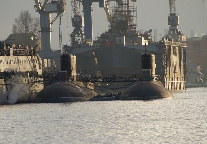 | Tàu ngầm Hà Nội và tàu ngầm Hải Phòng tại bến cảng nhà máy Admiralty. |