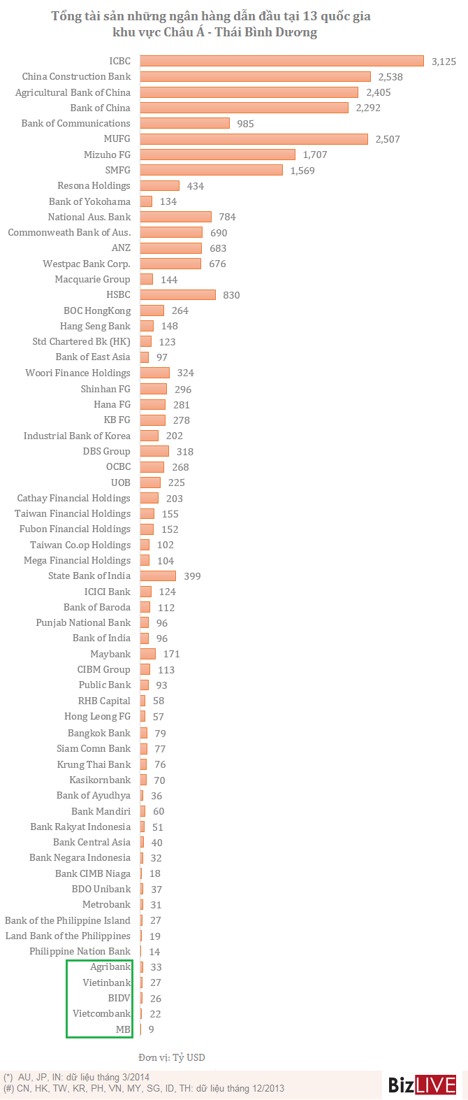 Một thống kê của SNL Financial về 5 ngân hàng lớn nhất tại mỗi quốc gia trong khu vực Châu Á – Thái Bình Dương cho thấy các nhà băng Việt Nam có quy mô tài sản nhỏ hơn rất nhiều các ngân hàng còn lại trong khu vực.