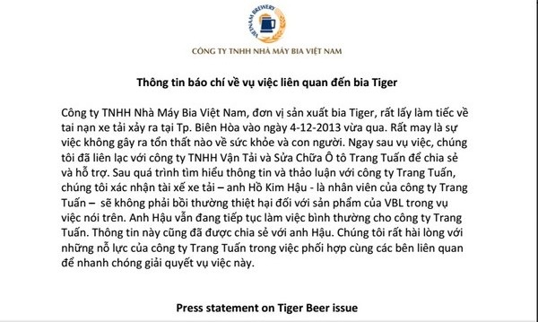 | Thông báo của công ty TNHH Nhà máy bia Việt Nam, đơn vị sản xuất bia Tiger. |