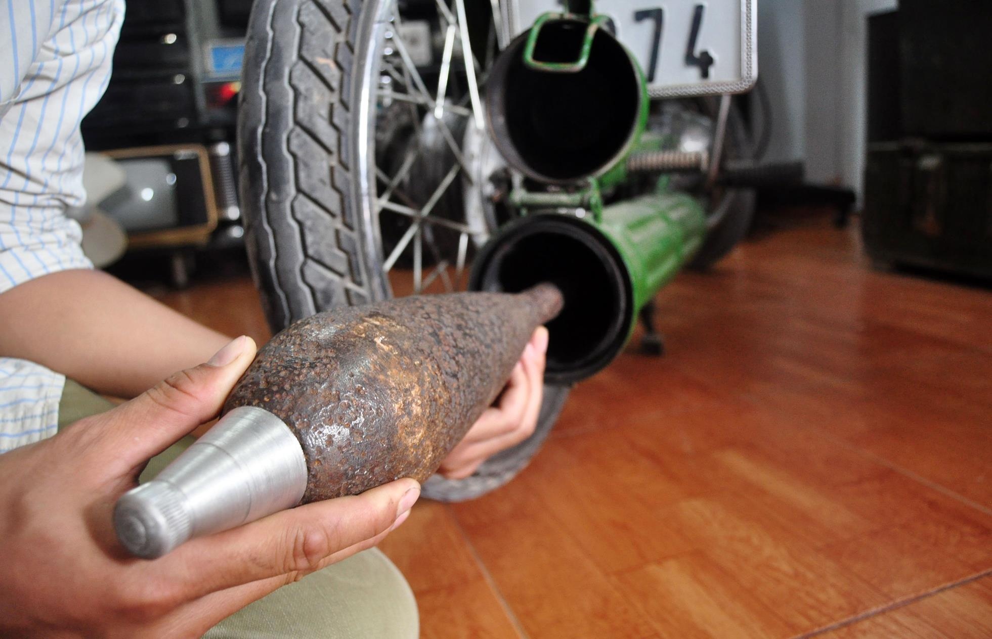 Chiếc Cub 81 phế thải đã được anh Điệp dùng vỏ đạn cối DKZ-82 mm và một số trang bị quân sự khác chế thành chiếc xe độc đáo.