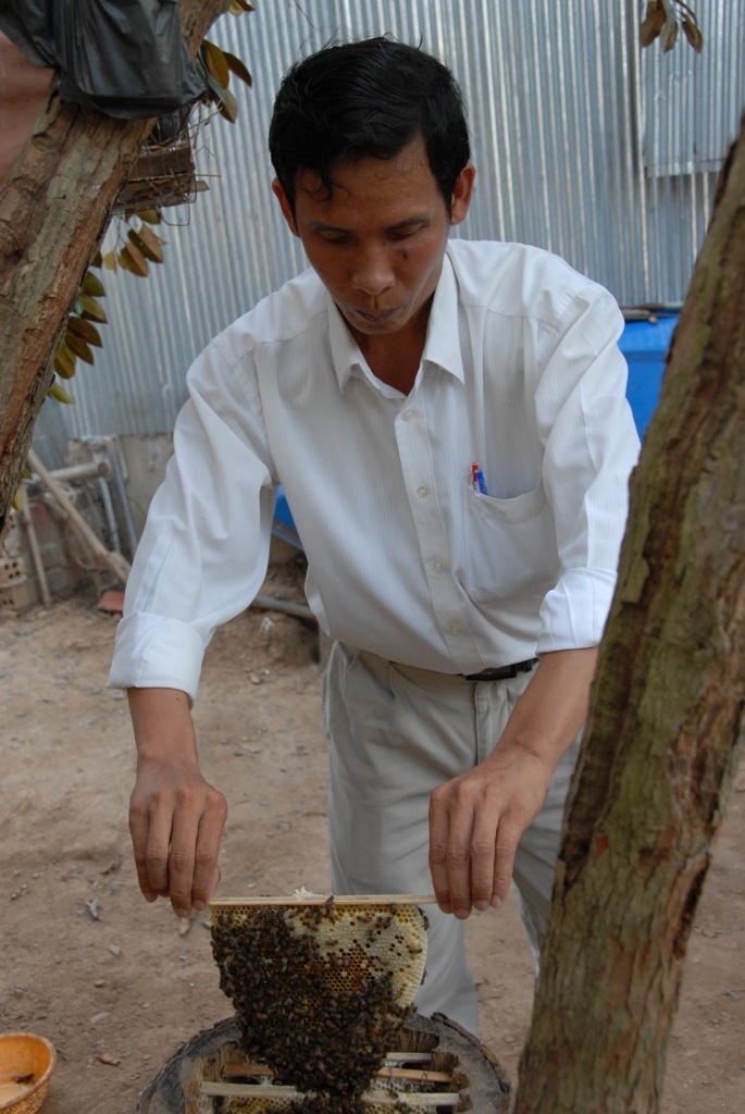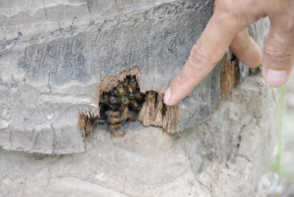 | Thông thường ong lấy mật được nuôi trong các thùng gỗ, nơi yên tĩnh không có người. Nhưng thầy giáo Hồ Văn Tạo lại nghĩ ra cách đưa ong vào bọng dừa để nuôi ngay trước cửa hay dưới gầm sàn nhà. |