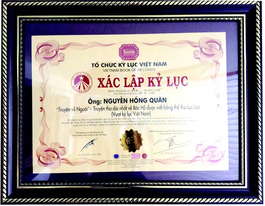 "Truyện về Người" của thầy giáo Nguyễn Hồng Quân vừa được trao Kỷ lục Việt Nam dưới dạng Truyện thơ dài nhất viết về Bác Hồ bằng thể thơ lục bát (13.519 câu) . Ảnh: Người Lao Động. |