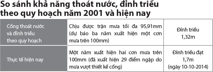 Cụ thể, quy hoạch được duyệt thời điểm này căn cứ mực nước triều 1,32m, lượng mưa dưới 100mm và 3 năm mới xuất hiện một lần. Nhưng hiện nay triều đã đạt tới 1,7m, lượng mưa trên 100mm và một năm xuất hiện đến 2 lần. Do vậy toàn bộ quy hoạch chống ngập thời điểm đó đến nay đã lỗi thời, không còn phù hợp.