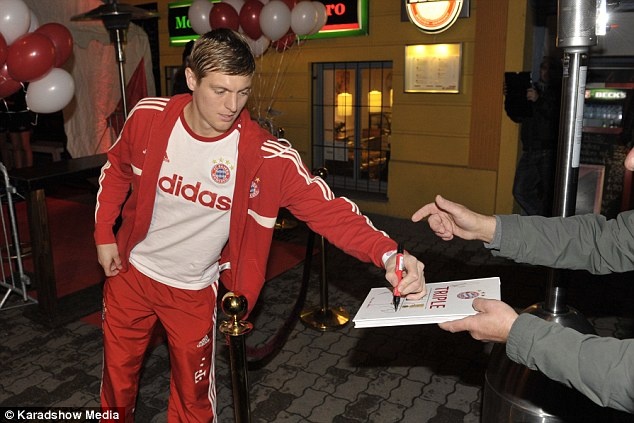 | "Bay đêm" nhưng Toni Kroos vẫn tỉnh táo và tranh thủ ký tặng người hâm mộ đang đợi phía ngoài. |