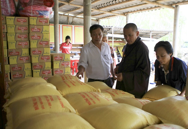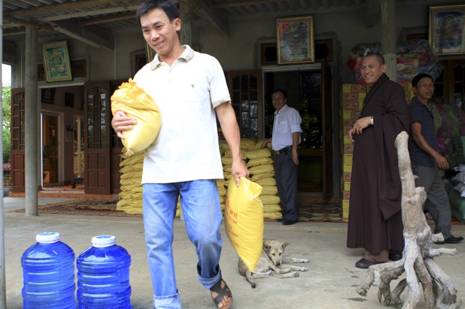 Đại đức Thích Tâm Hiệp, trụ trì Am Thụy ứng, đã kêu gọi được 4 tấn gạo cùng hàng trăm thùng mỳ từ các nhà hảo tâm để ủng hộ bà con Hải Vĩnh.