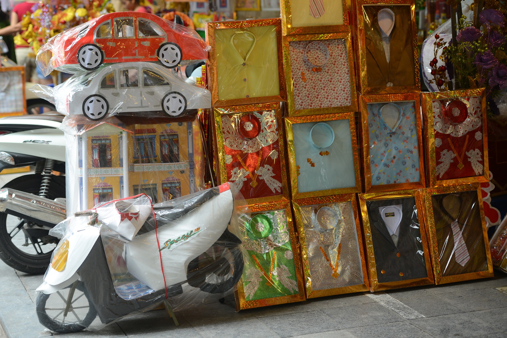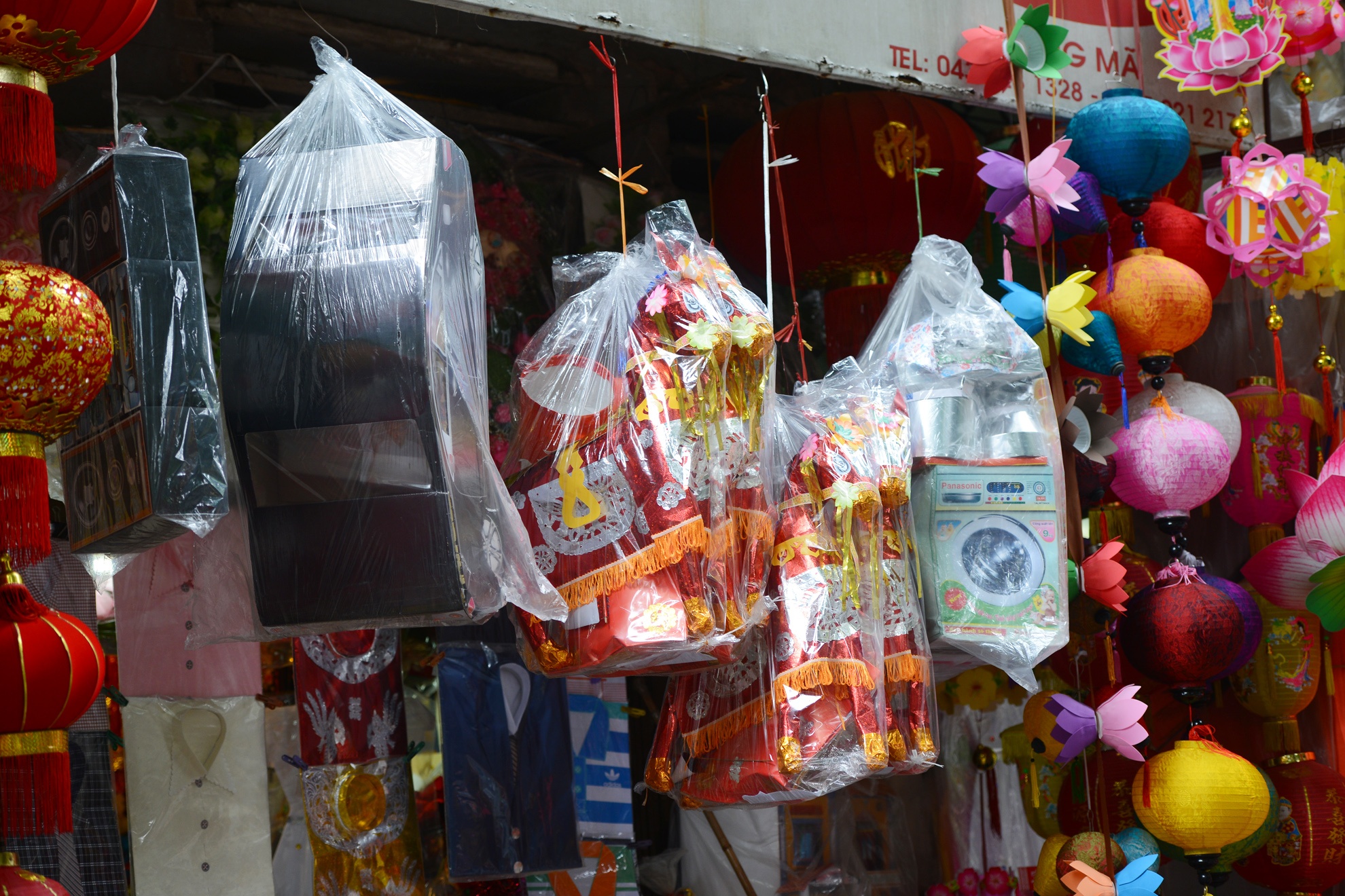 Trước dịp rằm tháng 7 - lễ Vu Lan báo hiếu vài ngày, phố Hàng Mã (Hà Nội) bày bán tràn ngập đồ dùng cho người cõi âm. Những chiếc xe máy bằng giấy như Spacy, SH hay ô tô Mercedes, nhà biệt thự không còn là mới mẻ đối với nhiều người khi đi qua đây chứng kiến.
