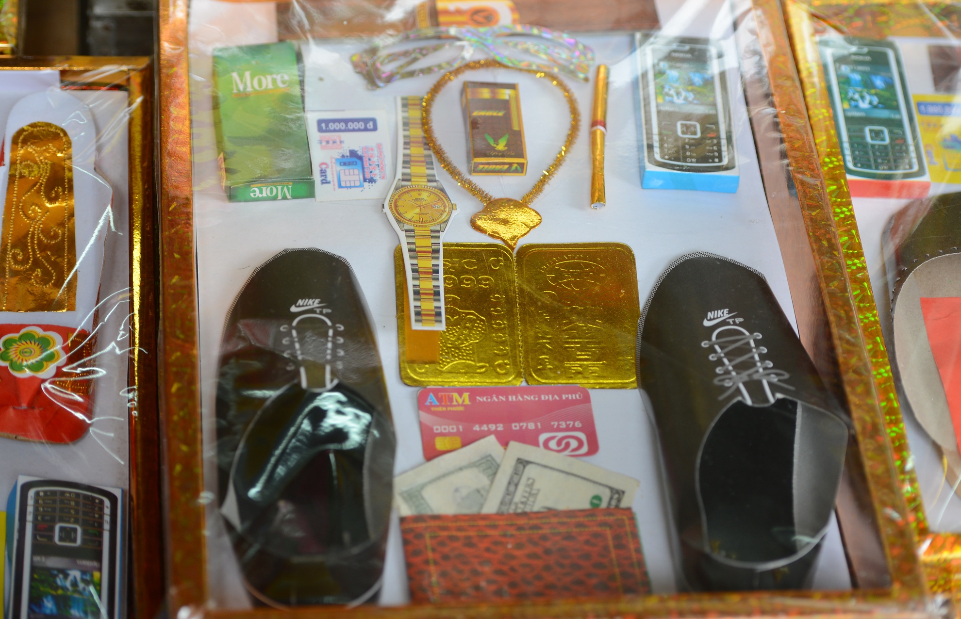 Một hộp sản phầm cho một người đàn ông đã từ giã cõi đời với đầy đủ vật dụng cần thiết gồm giầy mang thương hiệu Nike đồng hồ, dây chuyền vàng, điện thoại, ví da, thuốc lá, bật lửa, thẻ ATM và card điện thoại... Giá từ 30.000 đồng - 60.000 đồng tùy loại.