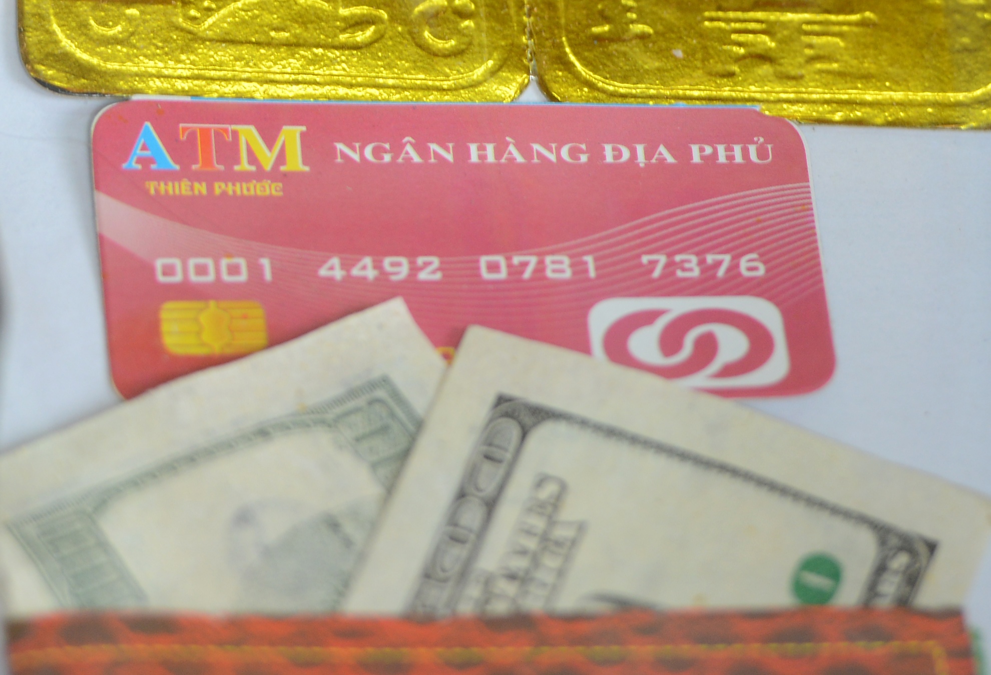 Người cõi âm muốn tiêu tiền thì tìm cây ATM mà rút, một chiếc thẻ thiết kế đúng như cỡ thật, trang trí đẹp cũng được bày bán kèm theo tiền đô la Mỹ và vàng lá.