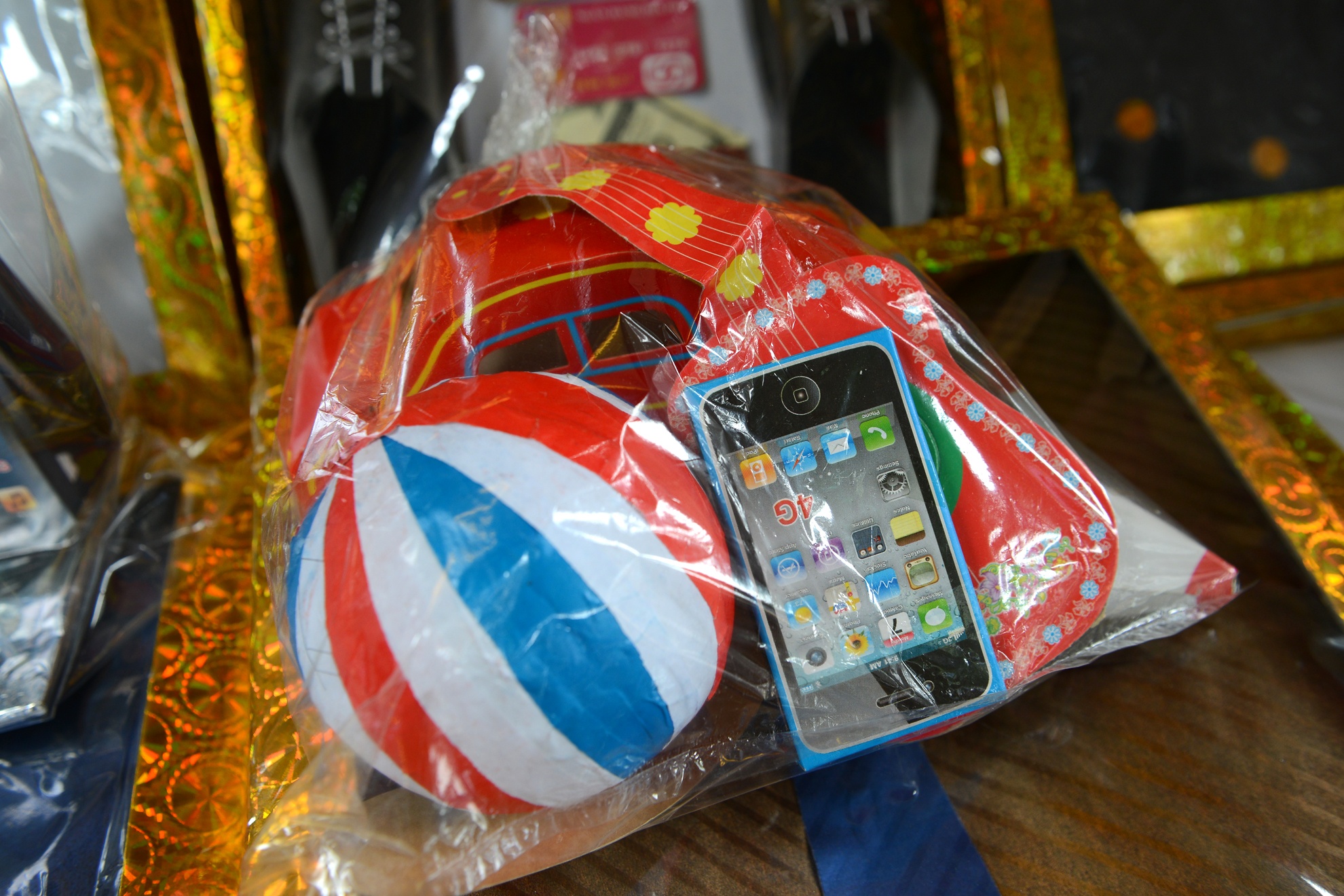 Gói đồ chơi vàng mã cho trẻ nhỏ bao gồm ô tô đồ chơi, bóng nhựa, đàn, điện thoại iPhone có giá 50.000 đồng.