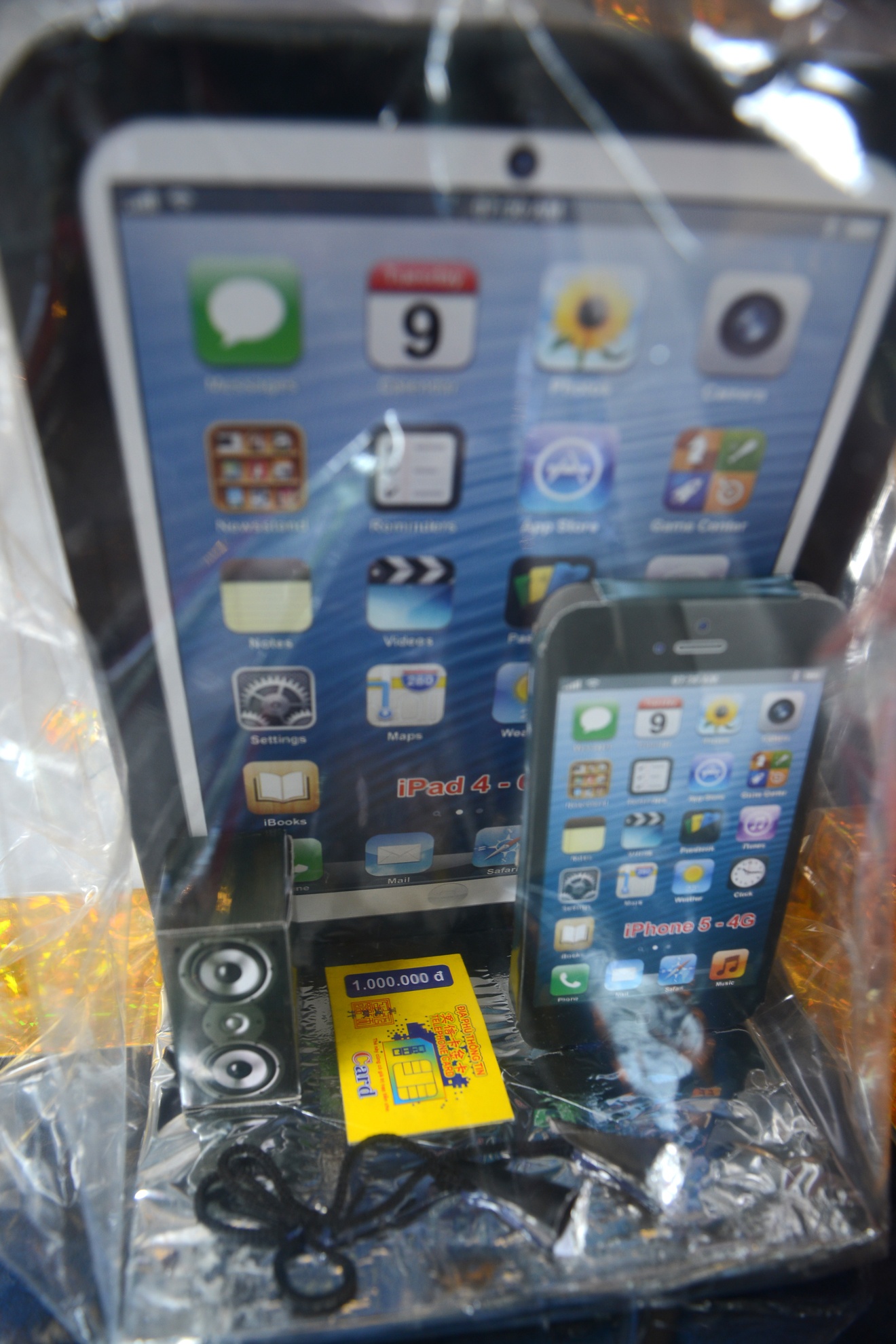 Người sản xuất vàng mã cũng liên tục thay đổi sản phẩm, mẫu mã mới phù hợp với thực tế. Nếu như các năm trước chỉ có iPhone, iPad 2, 3 thì năm nay đã có iPad 4, iPad mini màn hình retina, iPhone 5S... Gói sản phẩm này có giá 30.000 đồng bao gồm iPad 4, iPhone 5, loa, tai nghe và kèm theo cả bộ kit sim điện thoại (tất nhiên là giả).