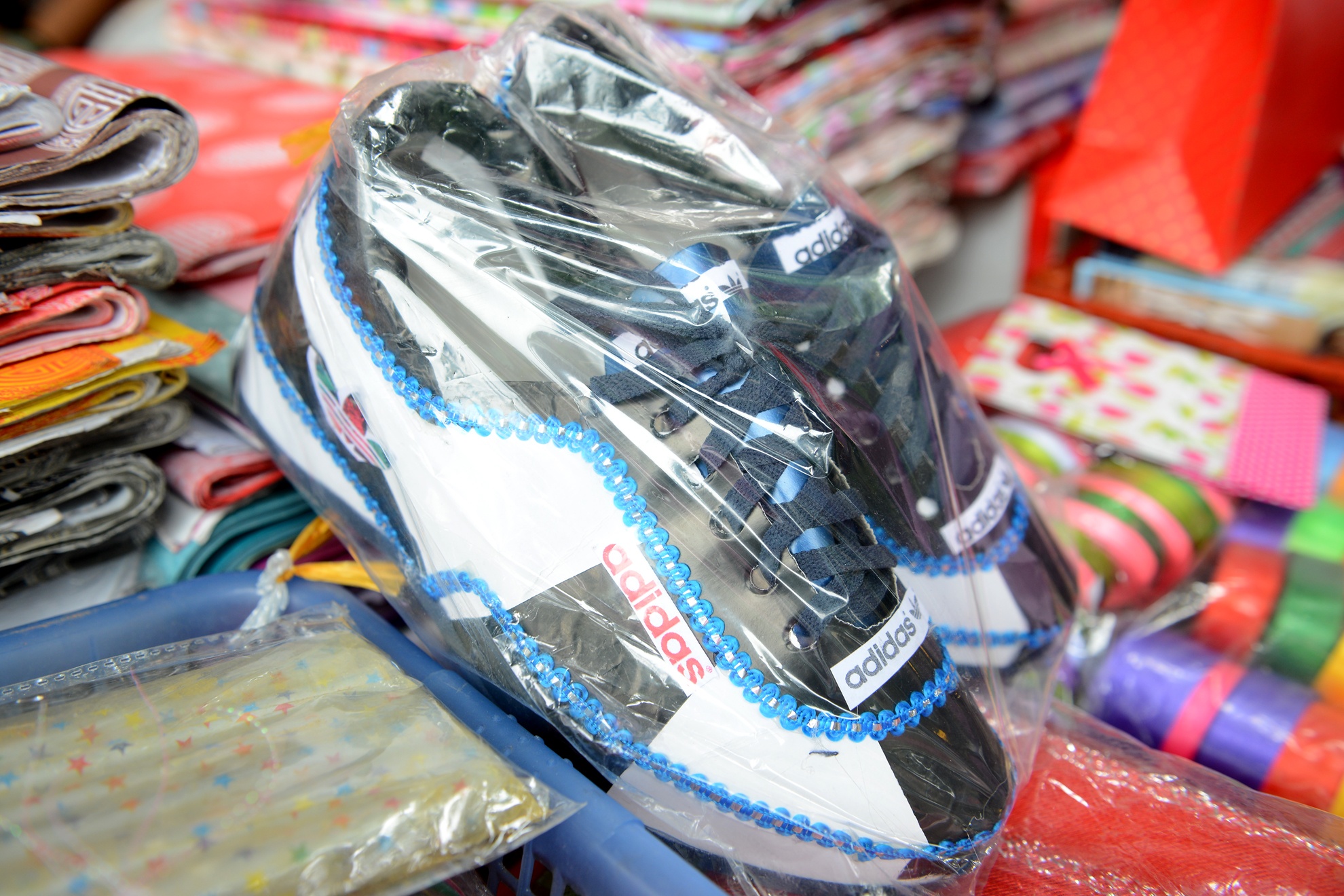 Giày thể thao Adidas được làm khá công phu và chi tiết, khiến nhiều người nhìn thoáng qua tưởng giầy thật. Giá 30.000 đồng một đôi.