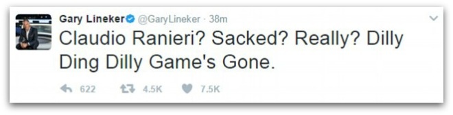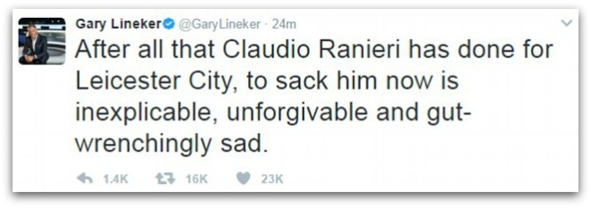 | Cựu chân sút đội tuyển Anh - Gary Lineker tỏ ra không phục trước quyết định sa thải Ranieri của Leicester City: "Claudio Ranieri? Bị sa thải? Thật sao? Vậy là không còn những trận cầu tưng bừng nữa rồi". |