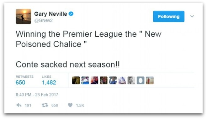 | Hậu vệ một thời của MU - Gary Neville dí dỏm cho rằng tương lai của HLV Conte có thể sẽ giống Ranieri khi cùng bị sa thải sau khi vô địch Premier League. Chelsea của Conte đang chễm chệ ở ngôi đầu Premier League và rất có thể họ sẽ lên ngôi ở mùa bóng này. |