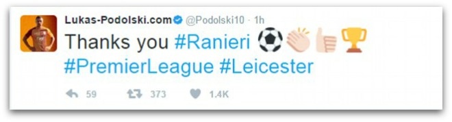 | Chân sút từng chơi cho Arsenal - Lukas Podolski dành những lời cảm ơn cho Ranieri sau những gì ông đã làm cho Leicester City và Premier League. |
