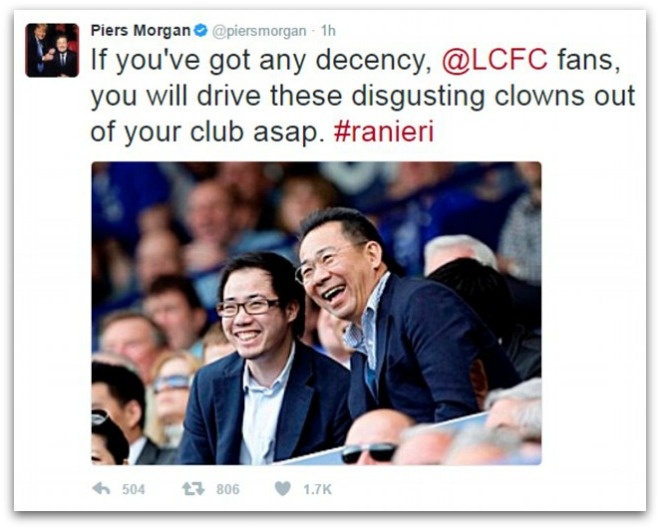 | Piers Morgan, một fan bóng đá nổi tiếng của Arsenal cho rằng phải tống khứ những ông chủ Thái Lan khỏi Leicester: "Nếu biết quy tắc thì những fan của Leicester City phải tống cổ ngay những tên hề kinh tởm này khỏi CLB". |