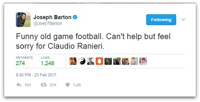 | Tiền vệ lắm tài nhiều tật Joey Barton tỏ ra tiếc nuối: "Cái trò cũ rích (sa thải HLV). Không thể giúp gì nhưng thấy rất tiếc cho Claudio Ranieri". |