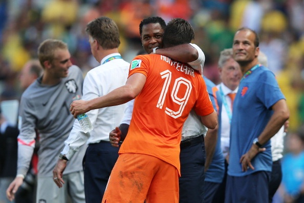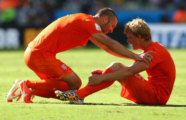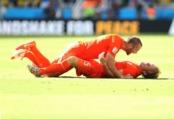 | Ron Vlaar đã đánh thức Dirk Kuyt khi cựu cầu thủ Liverpool vẫn còn chưa tin là chiến thắng đã đến với mình. |