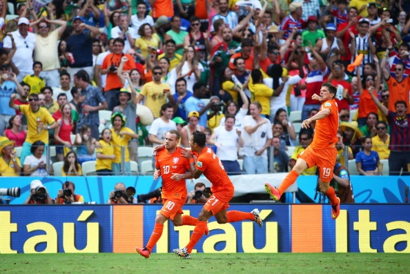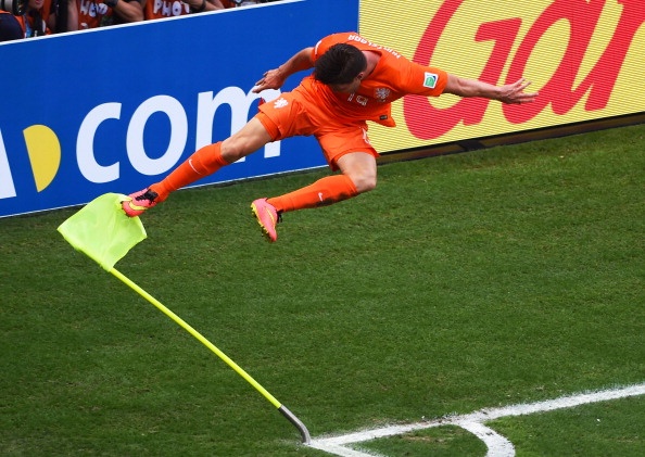 | Hình ảnh "thợ săn" Huntelaar tung người song phi vào cột cờ góc sau khi ấn định tỷ số 2-1 cho Hà Lan, khiến người ta liên tưởng tới hình ảnh cơn lốc cam cuốn phăng mọi thứ trên đường đi của nó. |