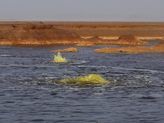 Núi lửa được bao quanh bởi một vùng nước mặn rất lớn, các mép rìa được tô điểm với những ụ hình nón và các khí của hóa chất tích tụ trong đó đến một đỉnh điểm nào đó chúng sẽ vỡ và thoát ra ngoài, mà nhìn vào giống như vô vàn ống khói xinh đẹp. Chất sulfuric trong con suối nước nóng nổi bong bóng sùng sụt khi đạt đến độ sôi nhất định.