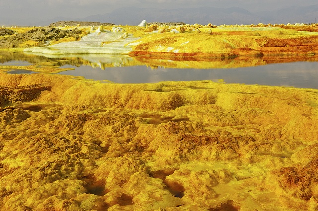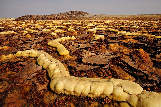 Lớp muối tích trữ bên dưới sa mạc Danokil, ở độ cao 136,8 m dưới mực nước biển, kết hợp với những chất có trong núi lửa như lưu huỳnh cho ra một hỗn hợp độc đáo, tạo hình ruộng bậc thang tuyệt đẹp. Mạch nước phun và những ụ hình nón xuất hiện ở khắp nơi trong khu vực núi lửa.