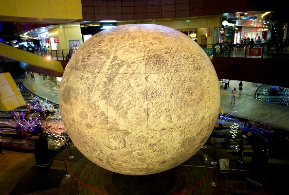 Mô hình Mặt trăng khổng lồ lấy ý tưởng từ tên gọi siêu trăng của mùa Trung thu năm nay. "Mặt trăng" được dựng lên trước cổng một trung tâm thương mại ở Nam Kinh, Trung Quốc. Ảnh: Getty