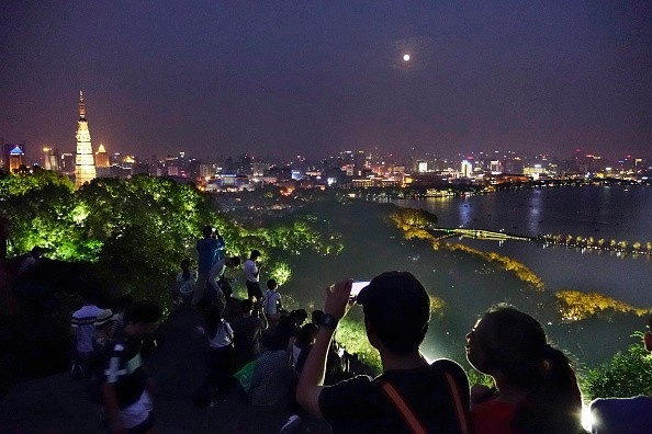 Người Trung Quốc chụp ảnh tự sướng tại thành phố Hàng Châu, tỉnh Chiết Giang, đêm Trung thu. Sau sự kiện đặc biệt năm nay, thế giới phải chờ 18 năm nữa để chứng kiến siêu mặt trăng và trăng máu cùng xảy ra trong một đêm. Ảnh: Getty