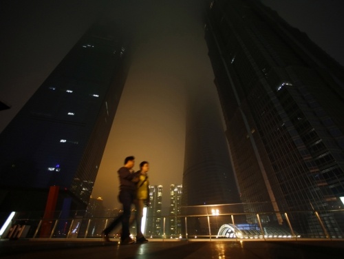 Người dân đi bộ qua các tòa nhà chọc trời tối đèn, bao gồm Trung tâm Tài chính Thế giới Thượng Hải (trái), Tháp Thượng Hải (giữa) và Tháp Jin Mao (phải) ở quận tài chính Pudong. Ảnh: AFP. |