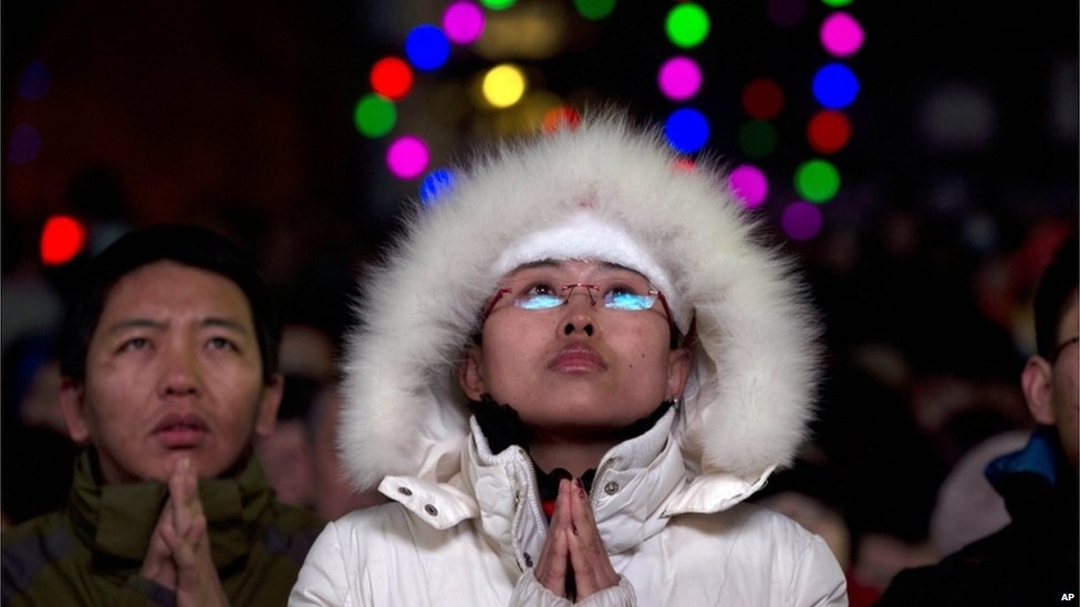 Giới trẻ Trung Quốc đón Giáng sinh tại thủ đô Bắc Kinh. Theo ước tính, Trung Quốc có khoảng 6 triệu tín đồ Công giáo, chiếm số lượng rất nhỏ dân số Trung Quốc. Tuy nhiên, người dân Trung Quốc bình thường cũng đổ ra đường trong dịp Giáng sinh. Ảnh: AP.
