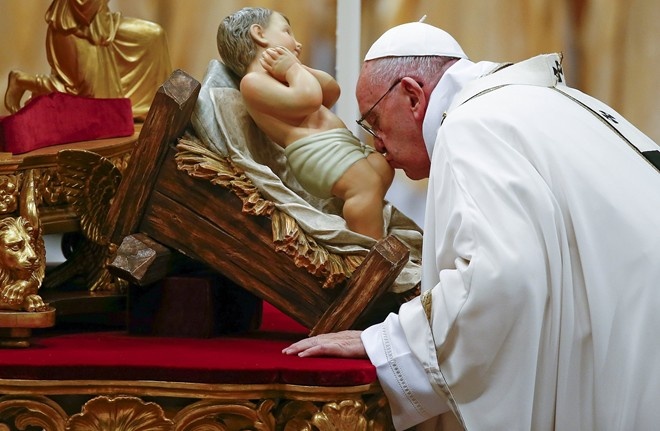 Giáo hoàng Francis ôm tượng Chúa hài đồng trong buổi lễ Giáng sinh tại Nhà thờ Basilica trên quảng trường St. Peter tại Rome. Khoảng 10.000 người dự buổi lễ, theo BBC. Ảnh: Reuters |