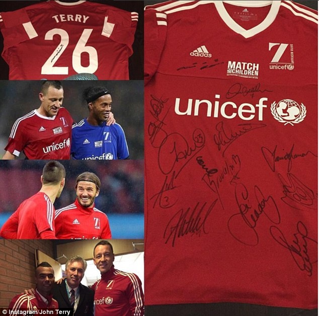 Trung vệ John Terry (thi đấu cho đội Vương quốc Anh) khoe chiếc áo có đầy đủ chữ ký của những cầu thủ tham dự "Trận đấu vì trẻ em". Chiếc áo này sẽ được bán đấu giá để dồn tiền cho quỹ UNICEF.