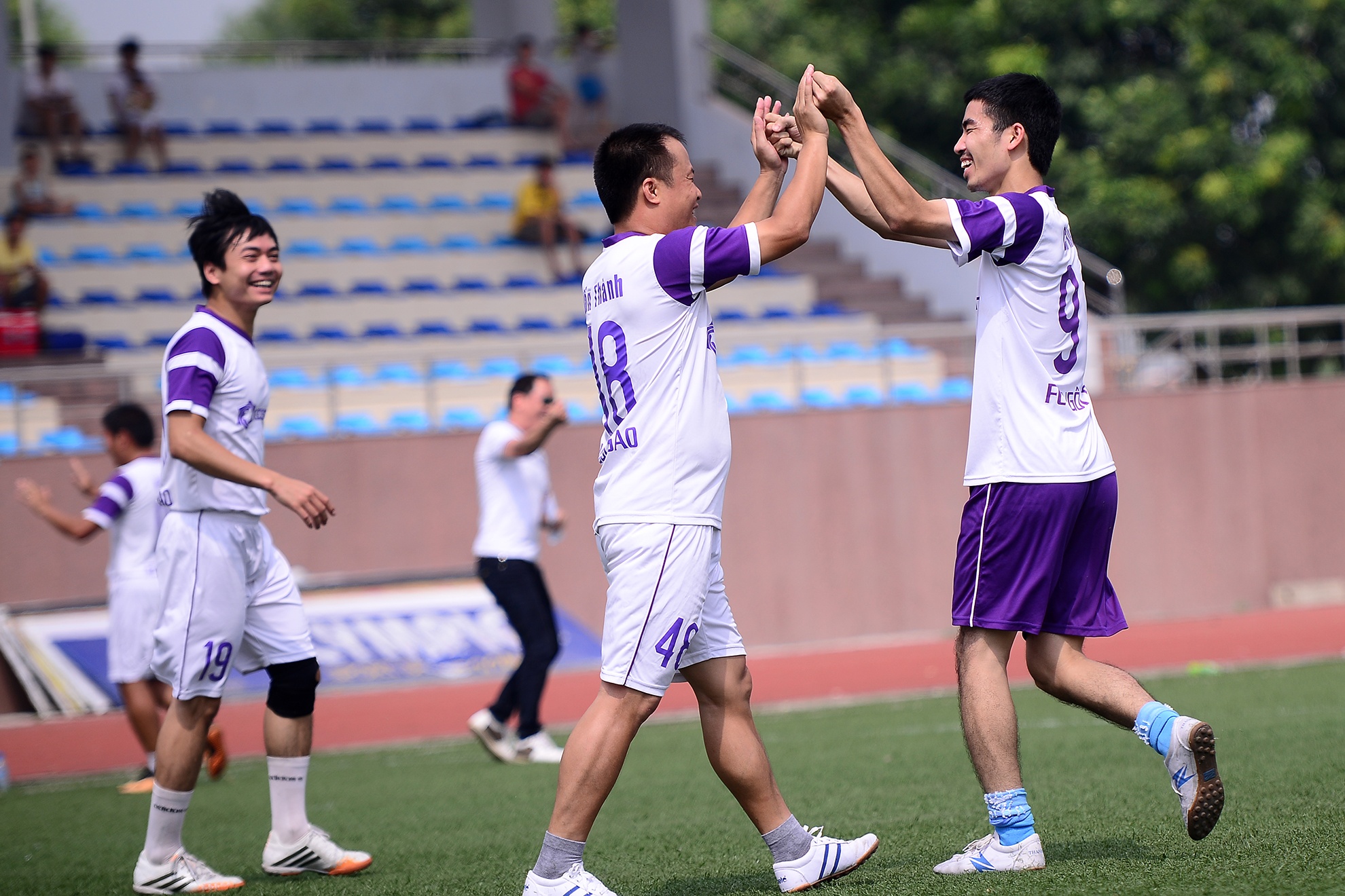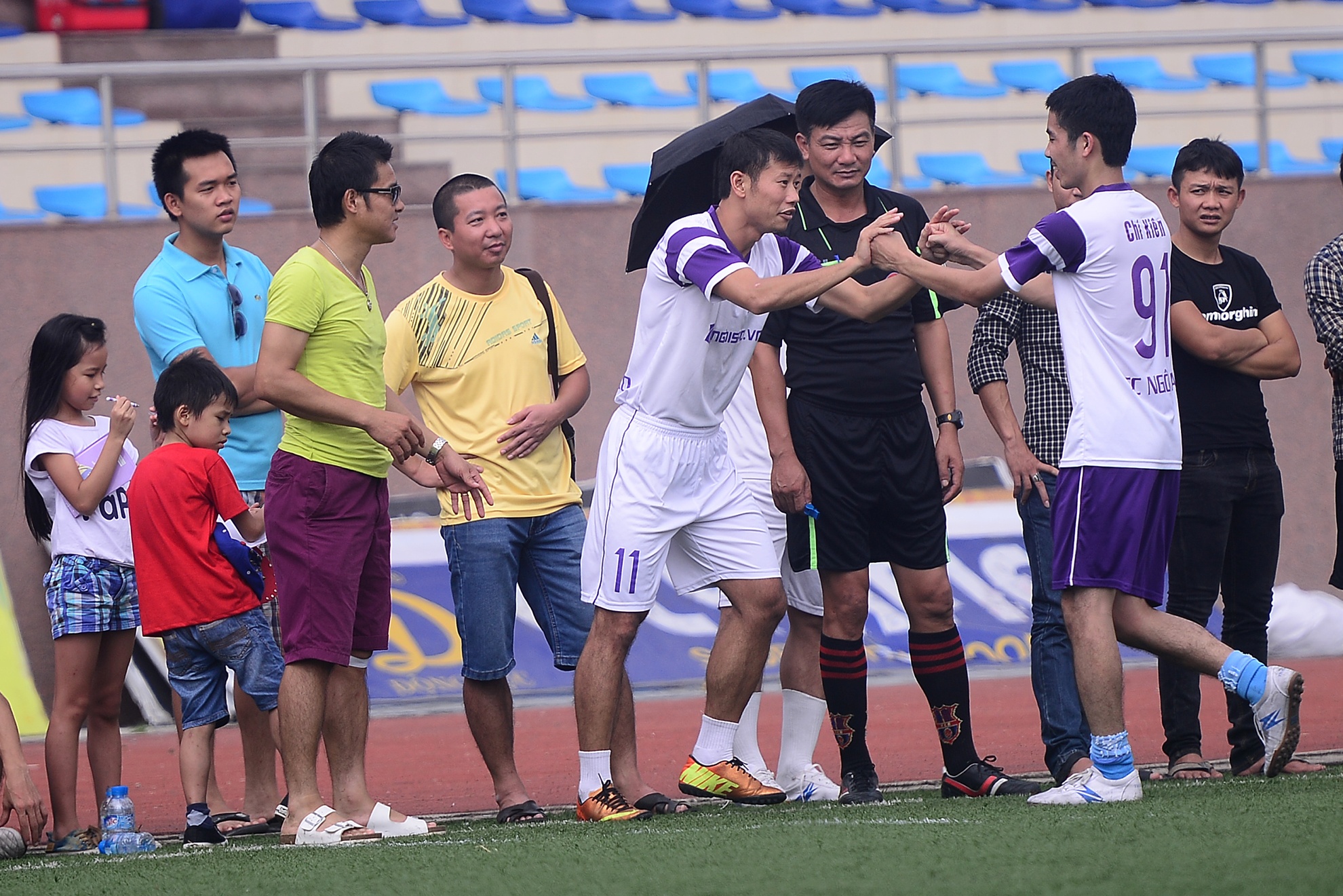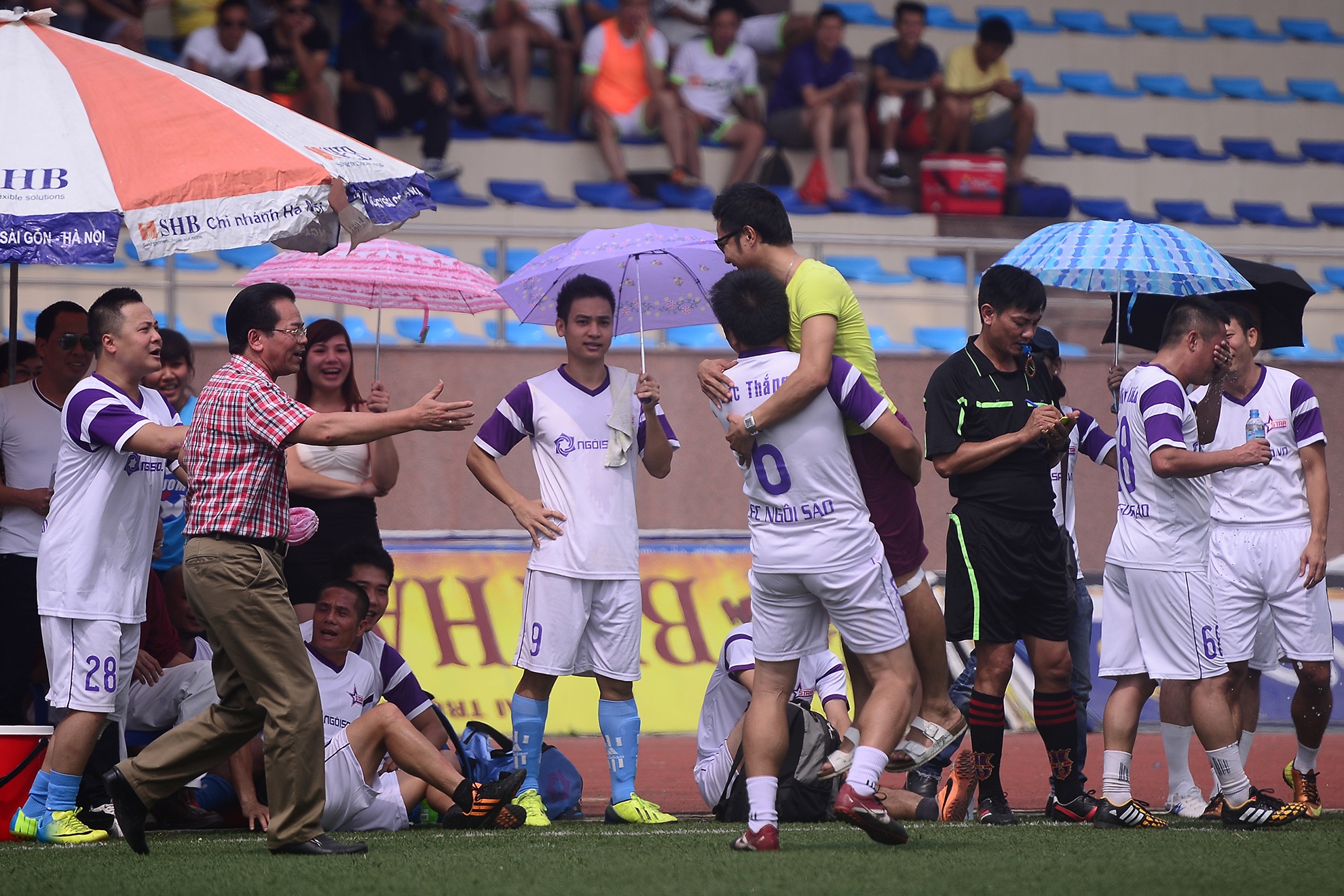 | Anh chạy đến nhấc bổng ông bầu Hồng Sơn đang đứng ở đường biên để chia vui. |