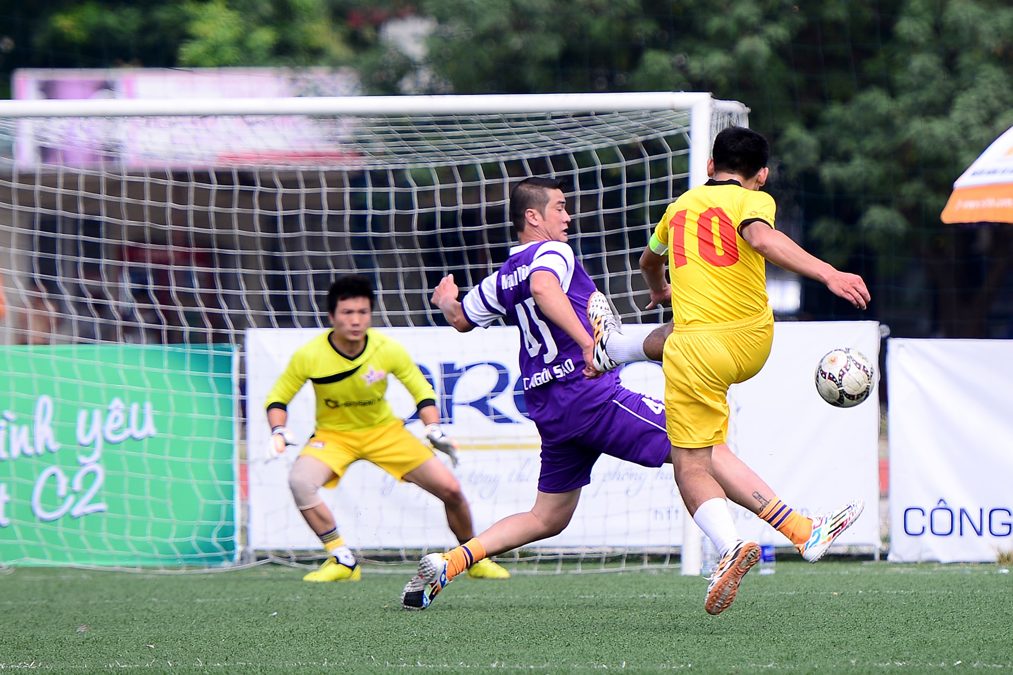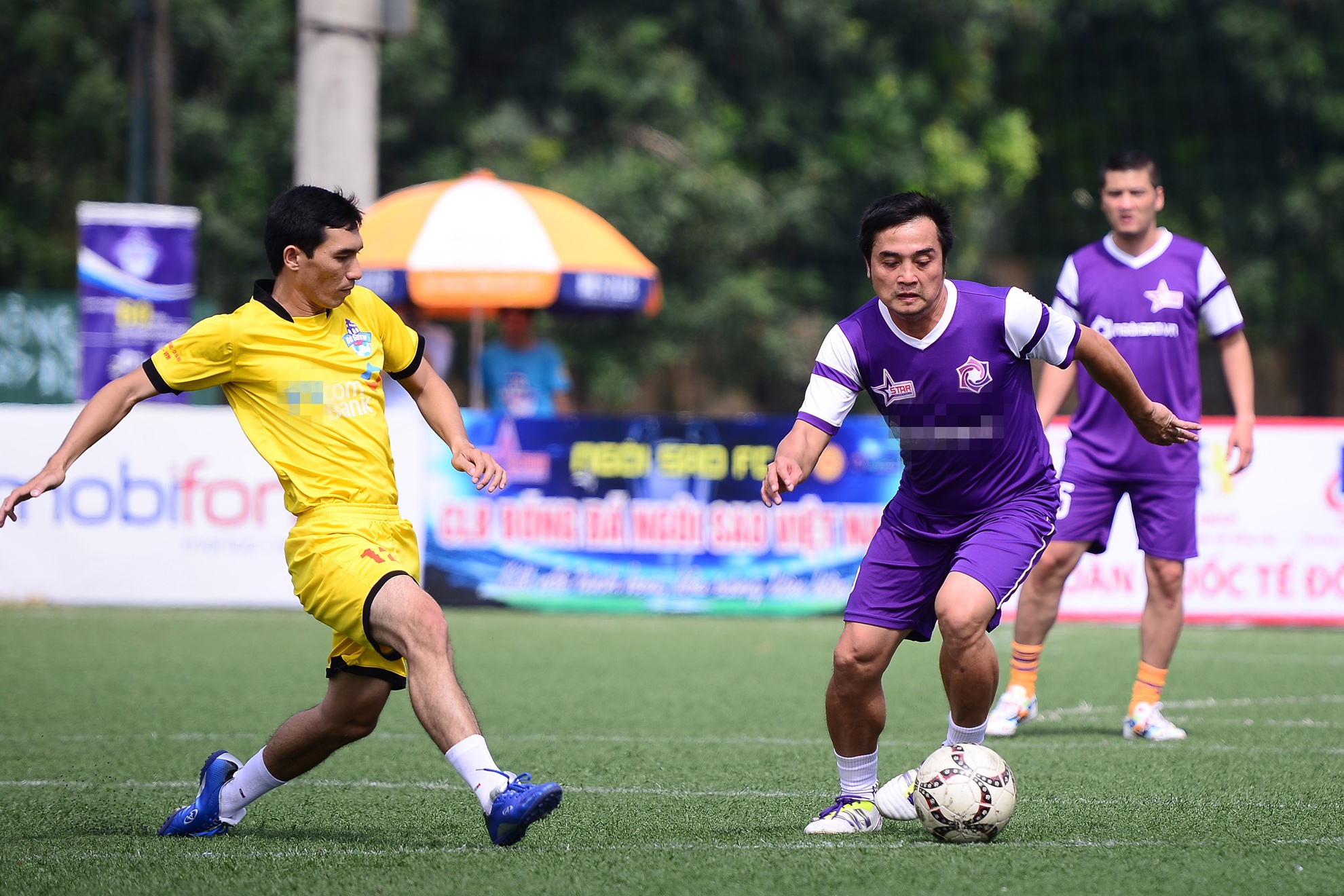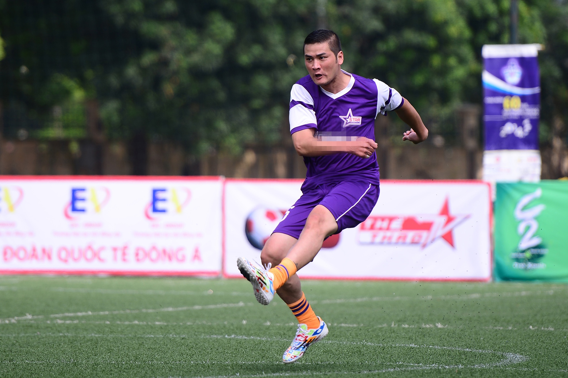 | Anh tung cú vô lê như trái phá trước sự truy cản của hai hậu vệ đối phương vào góc xa khung thành mở tỉ số cho đội tuyển Ngôi sao. |